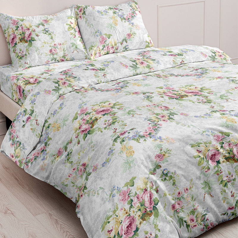 Натуральная прочная ткань, изготовленная шуйскими ткачами, отличается прочностью, яркими красками и многообразием принтов. Комплекты сшиты из ткани шириной 220 см, поэтому простыни и пододеяльники будут без швов. Плотность 142 г/м². 100% хлопок.