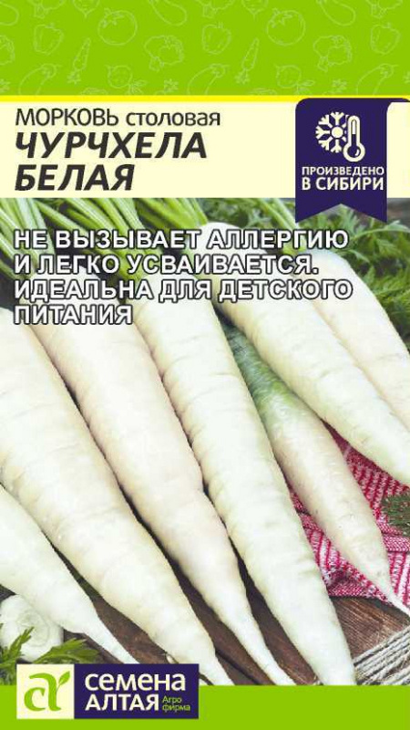 Среднеспелый (100-115 дней) урожайный сорт. Корнеплод удлиненно-конусовидный, с заостренным кончиком, длинной 18-22 см (при хорошем минеральном питании может достигать длины более 30 см), массой 100-150 г, с белой корой и сердцевиной. Мякоть хрустящая, очень сладкого и нежного вкуса, сочная. В этой моркови нет красящих веществ, поэтому она не вызывает аллергию и отлично усваивается. Такая морковь – отличный вариант для детского питания. Плоды не теряют своих вкусовых качеств после термической обработки. Отлично хранится.