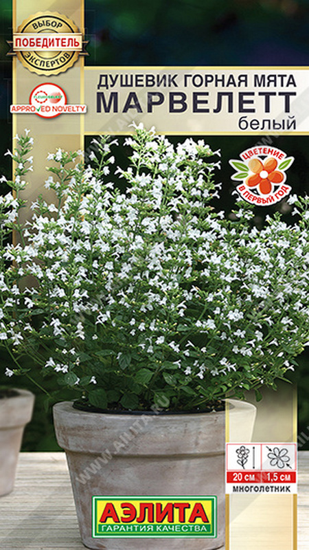 Пряно-ароматический многолетник. Отмечен международной организацией производителей цветочных семян FLEUROSELECT за выдающиеся декоративные и технологические качества. Компактные растения, высотой 20 см и шириной 30 см, полностью усыпаны мелкими белоснежными цветами. Душевик прекрасно подходит для посадок вблизи дома и мест отдыха, у скамеек и беседок, в кашпо и вазоны, чтобы ощущать приятный аромат при каждом соприкосновении с растением. Привлекает пчел и других насекомых-опылителей. Не требует прищипки и регуляторов роста. Растение можно использовать в пищу в свежем или сушеном виде.