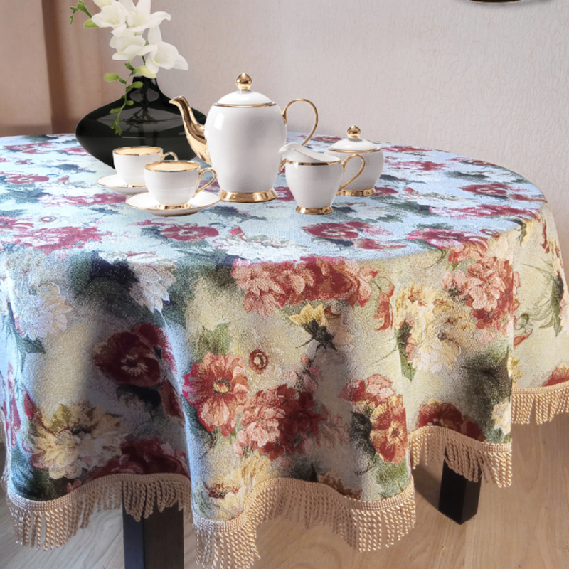 Декоративные скатерти из гобеленовой ткани это популярный предмет интерьерного текстиля. Наряду со шторами, покрывалами, диванными и другими подушками, гобеленовые скатерти помогают добавить в интерьер помещения, домашнего тепла и уюта. Гобеленовая скатерть хорошо стирается в теплой воде 30 градусов, практически не садится и теряет формы. Края скатертей обшиты бахромой, гармонирующей по цвету с цветом скатерти.