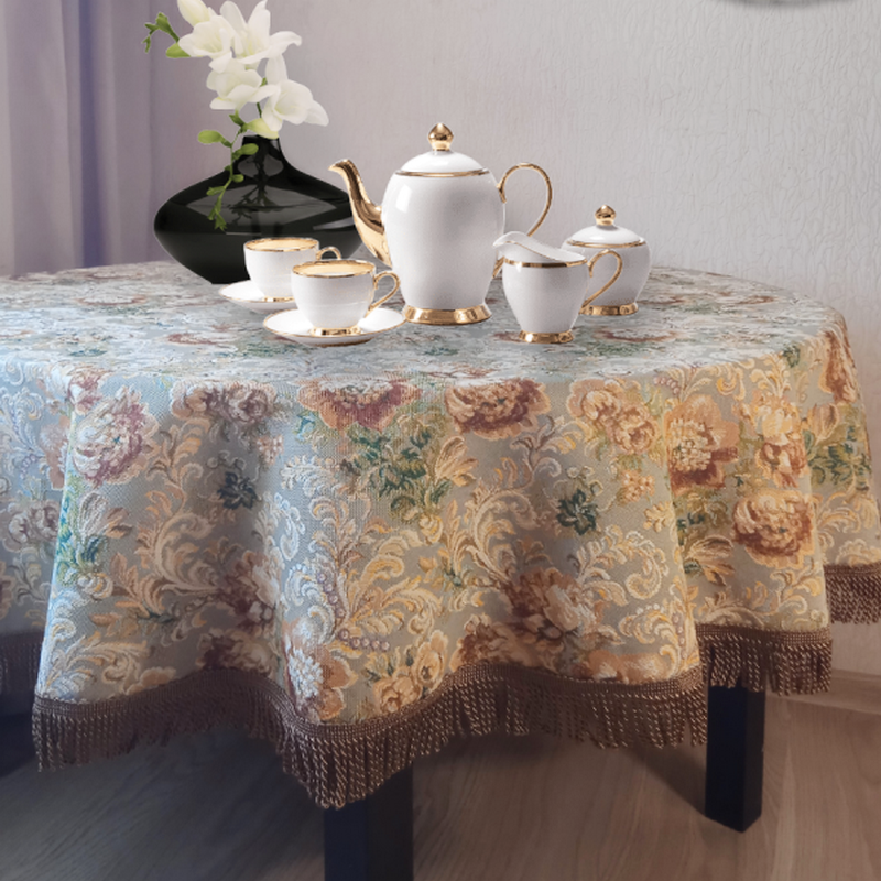 Декоративные скатерти из гобеленовой ткани это популярный предмет интерьерного текстиля. Наряду со шторами, покрывалами, диванными и другими подушками, гобеленовые скатерти помогают добавить в интерьер помещения, домашнего тепла и уюта. Гобеленовая скатерть хорошо стирается в теплой воде 30 градусов, практически не садится и теряет формы. Края скатертей обшиты бахромой, гармонирующей по цвету с цветом скатерти.