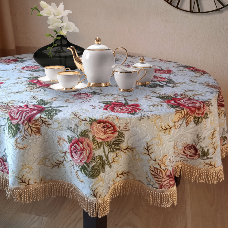 Декоративные скатерти из гобеленовой ткани это популярный предмет интерьерного текстиля. Наряду со шторами, покрывалами, диванными и другими подушками, гобеленовые скатерти помогают добавить в интерьер помещения, домашнего тепла и уюта. Гобеленовая скатерть хорошо стирается в теплой воде 30 градусов, практически не садится и теряет формы. Края скатертей обшиты бахромой, гармонирующей по цвету с цветом скатерти.