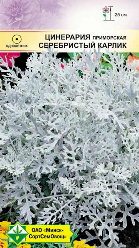 Очень популярное декоративное растение с серебристо-белыми густоопушенными и мелкорасчлененными листьями высотой до 25 см. Выращивают как однолетник. Рекомендуется для бордюров, групповых посадок, балконных и горшечных насаждений в контрастных сочетаниях с цветущими цветами. Выращивают посевом семян на рассаду в марте или непосредственно в открытый грунт в мае. Если до наступления сильных морозов укрыть, растение перезимует.